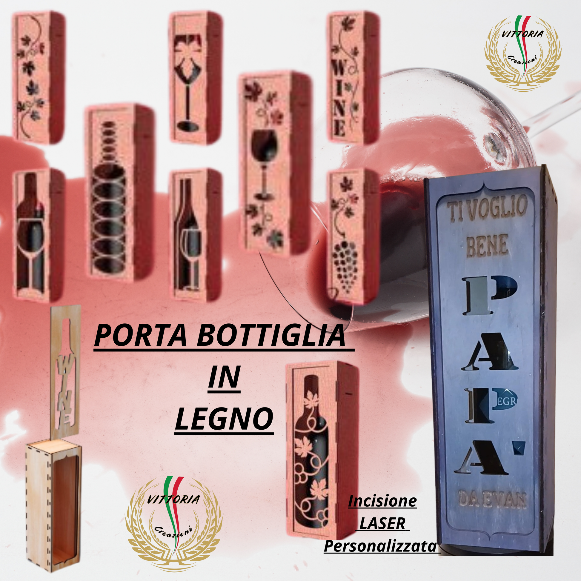 Scatola regalo per bottiglia, realizzata in LEGNO. Possibilità di personalizzare la parte frontale. Taglio e incisione laser personalizzata.